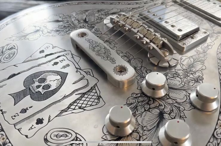ゼマイティスのギターは、その独特の外観が特徴的です。特にメタルフロントと呼ばれるデザインが有名で、アルミニウムプレートに彫刻を施したものがトップに使用されています。これは、ビジュアル的な魅力だけでなく、サウンドにも影響を与え、独特の音色を生み出します。